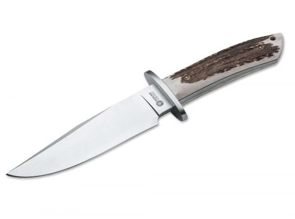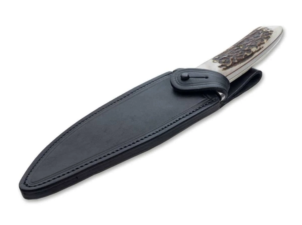 Elegantes Jagdmesser mit einer Gesamtlänge von 29,3 cm bei weitem Einsatz. Die Klinge ist 14,5 cm lang und besteht aus Edelstahl N695 (58 HRC). Der Griff besteht aus Hirschgeweih, das mit Nieten befestigt wird. Kommt mit Ledertasche.