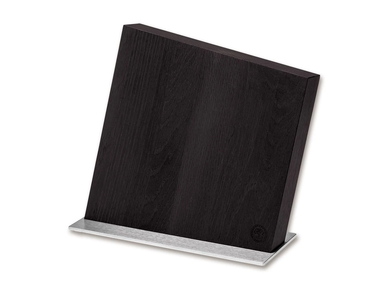 Schräger Holzmesserständer aus dunklem Eichenholz auf Sockel aus Edelstahl. Das platzsparende Design kann dank versteckter Magnete bis zu acht Messer aufnehmen. Messer sind nicht enthalten. Höhe: 24,5 cm Breite: 10 cm Tiefe: 25 cm