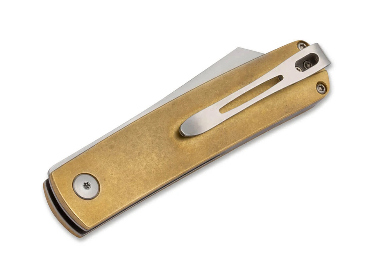 Die Klinge aus hochwertigem VG10-Stahl lässt sich mit einem Daumenknopf öffnen. In der geöffneten Position wird er durch das Linerlock gesichert. Der Griff ist aus Messing, das mit der Zeit eine einzigartige Patina annimmt. Das Messer ist mit einem Clip zum Tragen in einer Hosentasche ausgestattet.